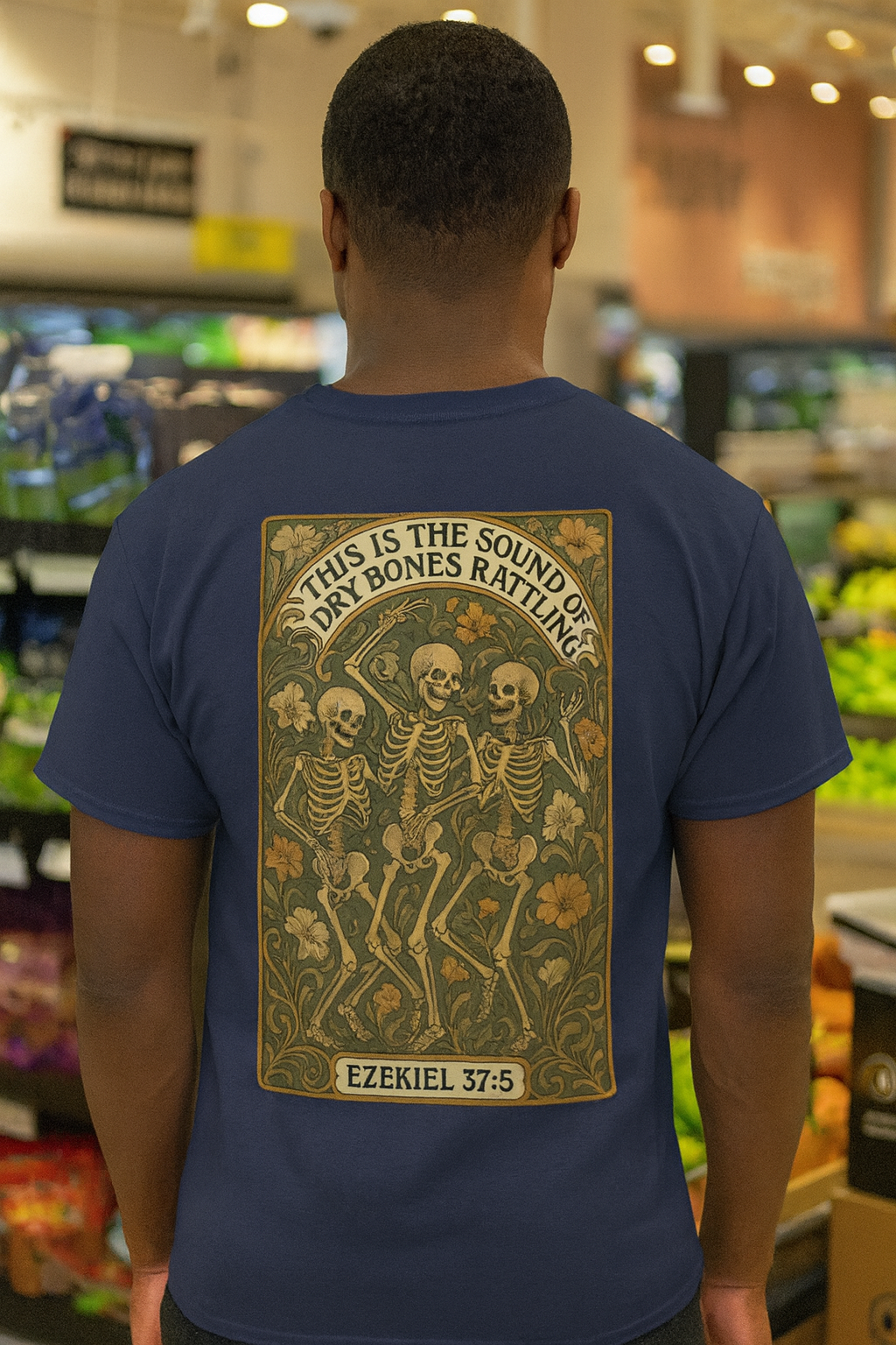 Bring bold style and timeless comfort together with this unique unisex tee. Featuring a striking back print inspired by Ezekiel 37:5 – “This is the sound of dry bones rattling” – the design showcases a vintage-style illustration of dancing skeletons framed with ornate detailing, giving the shirt both a statement look and a touch of classic artistry.