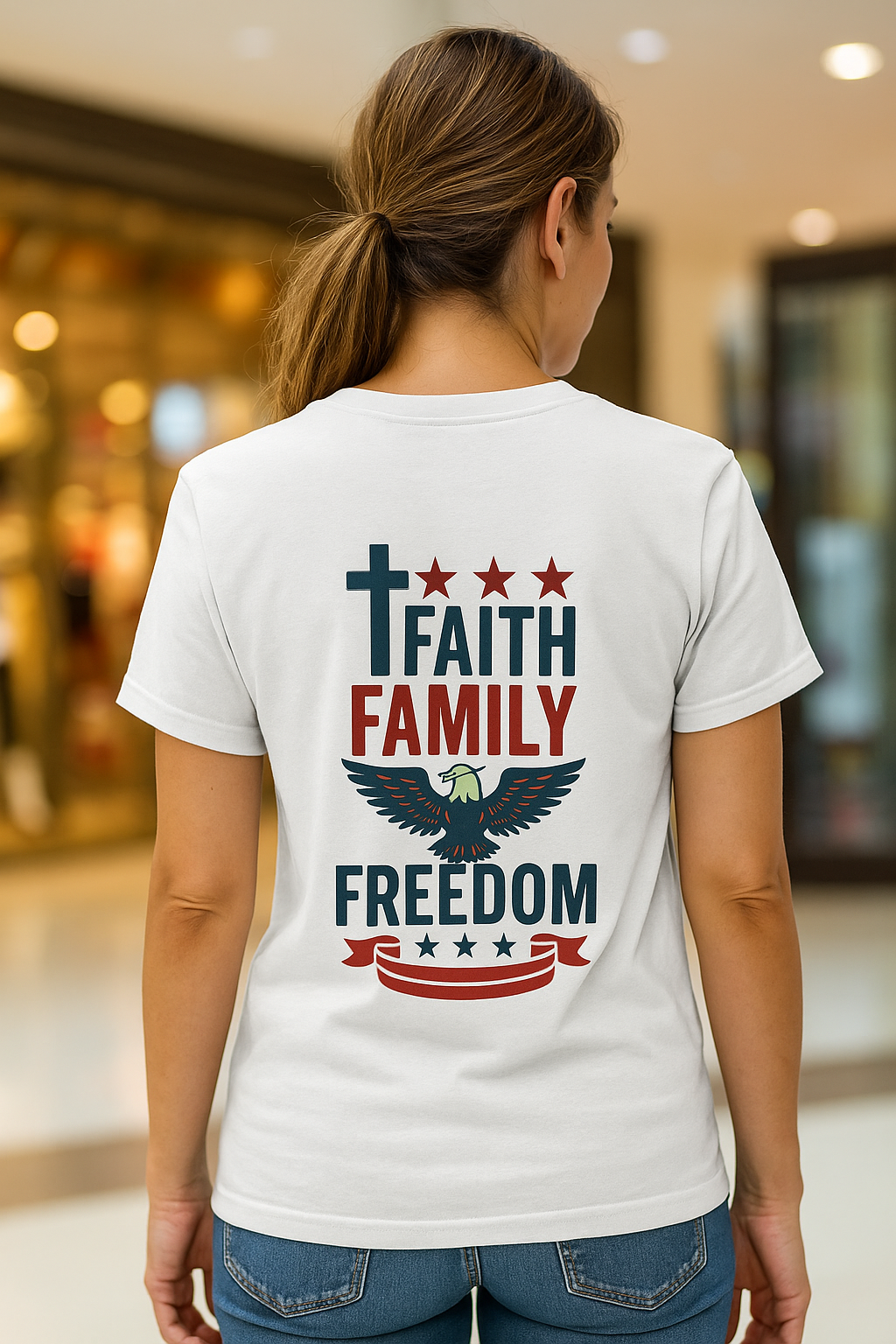 Show off your values in style with this bold and patriotic graphic tee. Featuring a striking design with a cross, stars, and a soaring eagle, this shirt celebrates the core pillars of Faith, Family, and Freedom. Printed in rich red and navy, it’s perfect for everyday wear, patriotic holidays, or gatherings where you want to share your pride.