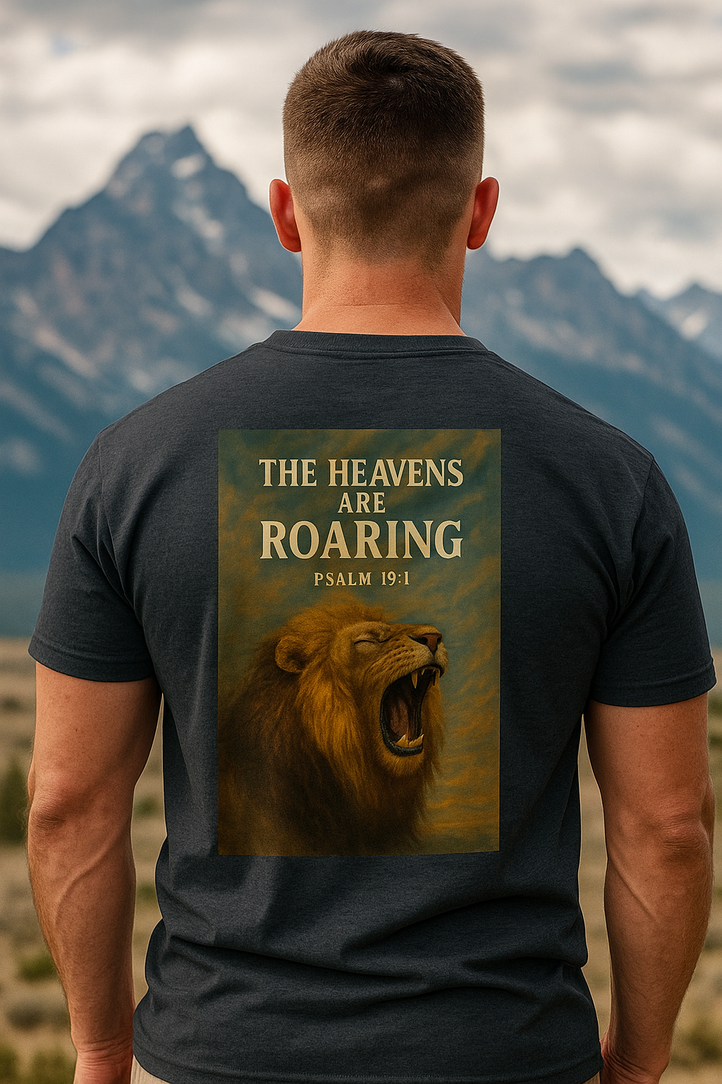 Inspired by Psalm 19:1 — “The heavens declare the glory of God; the skies proclaim the work of His hands.” — this tee calls you to live boldly in faith. Featuring a powerful roaring lion on the back, it’s a striking reminder that God’s creation proclaims His majesty and that we, too, are called to declare His glory.