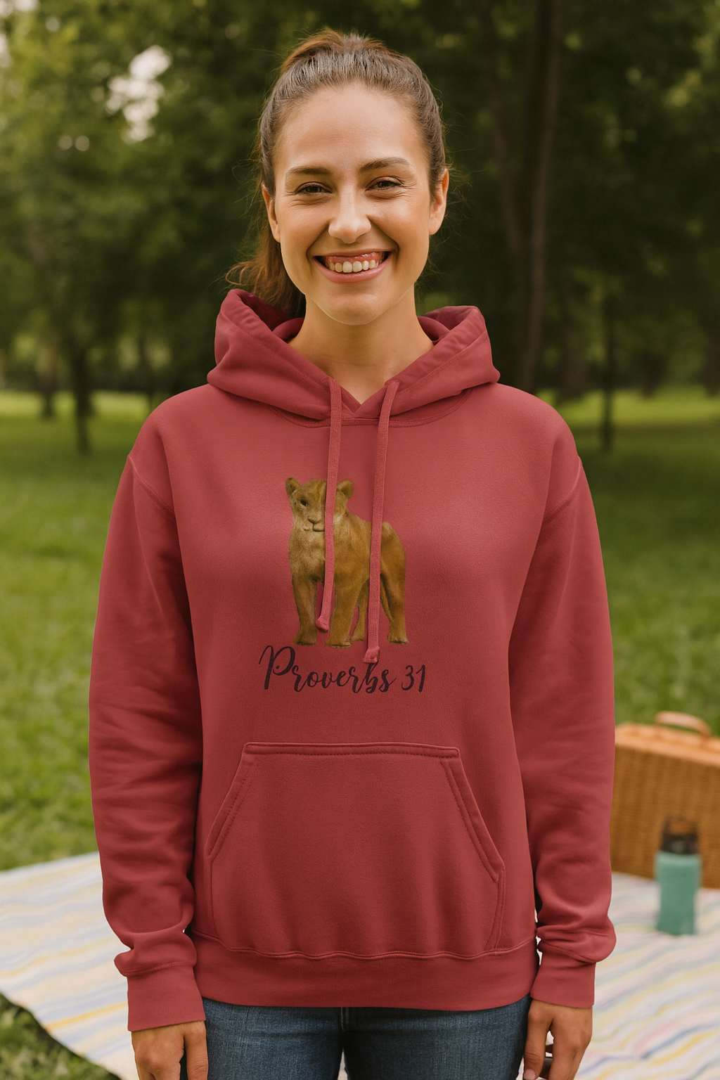 Bold faith, fearless strength. The Proverbs 31 Lioness hoodie brings the spirit of wisdom and courage to life with a striking lioness design and vibrant script. The lioness, a symbol of protection and grace, is a reminder of the enduring strength and beauty found in Proverbs 31.