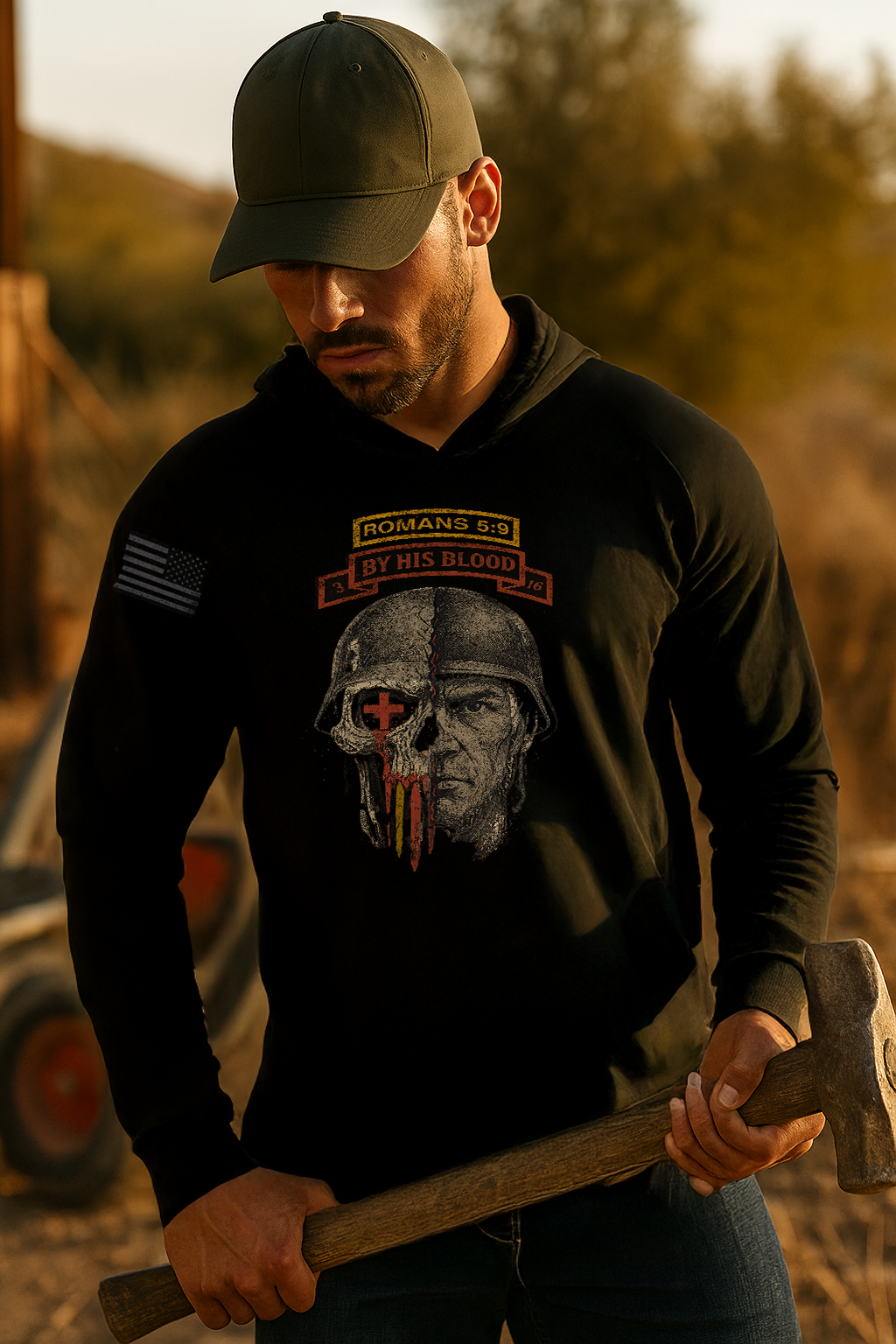 The BY HIS BLOOD Romans 5:9 Warrior Pullover Hooded Tee – Liberty & Victory Edition brings scripture and symbolism together with modern performance wear. Featuring the fractured warrior helmet and bold banner across the back, this design declares redemption through Christ’s sacrifice. The Liberty & Victory® logo on the left sleeve and the American flag on the right sleeve complete the statement — faith, freedom, and endurance in one powerful piece.